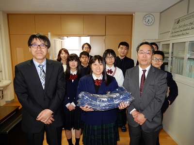 平成30年4月18日(水)本校校長室にて、本校同窓会様より浴衣及び帯をチーム「じゃんがら」へ寄贈していただきました。同窓会を代表され、同窓会副会長馬目浩二様より「今年もがんばって活動してください」との激励の言葉を添えられ、真新しい浴衣と帯が手渡されました。チーム「じゃんがら」リーダーからは、「これからも活動をがんばるので応援よろしくお願いします」と感謝の言葉を述べました。新しい浴衣を着て「じゃんがら」を披露できる日をメンバー達は大変楽しみにしておりました。同窓会の皆様本当にありがとうございました。
