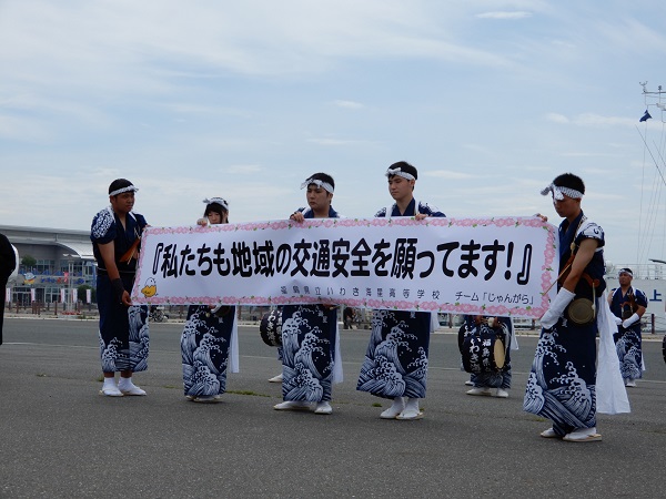 平成30年7月13日(金)、いわき市小名浜のアクアマリンパークにおいて東警察署主催の平成30年夏の交通事故防止県民総ぐるみ運動出動式が行われました。そこで、いわき海星高校チーム「じゃんがら」による「じゃんがら念仏踊り」を披露させて頂きました。生徒一人一人が、交通安全の祈りを込めて一生懸命演舞していました。