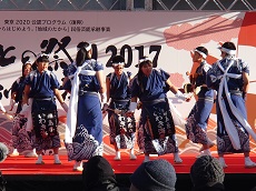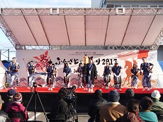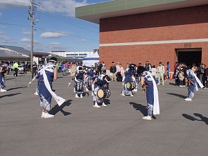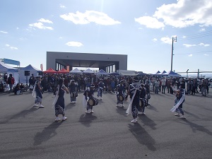 風が強く気温も低かったのですが、天気には恵まれ多くのご来場者様が来られる中でオープニングと12時30分からの2回、演舞を披露させて頂きました。演舞が始まると寒い中、多くの方が足を止めてじゃんがら念仏踊りを観てくださったことが生徒の励みにもなり、寒い中でも一生懸命頑張りました。