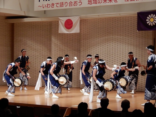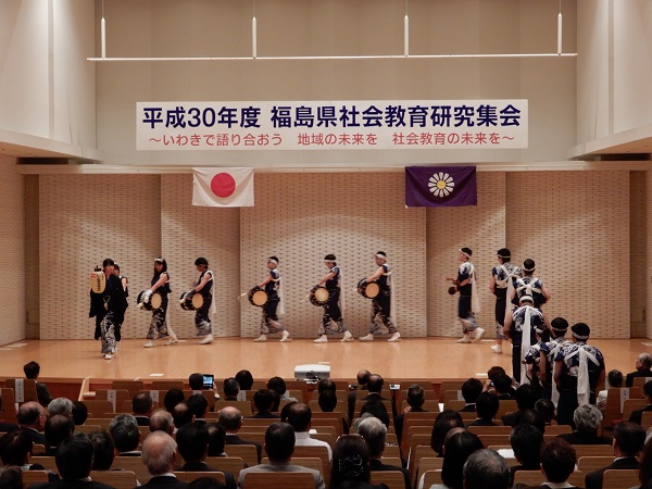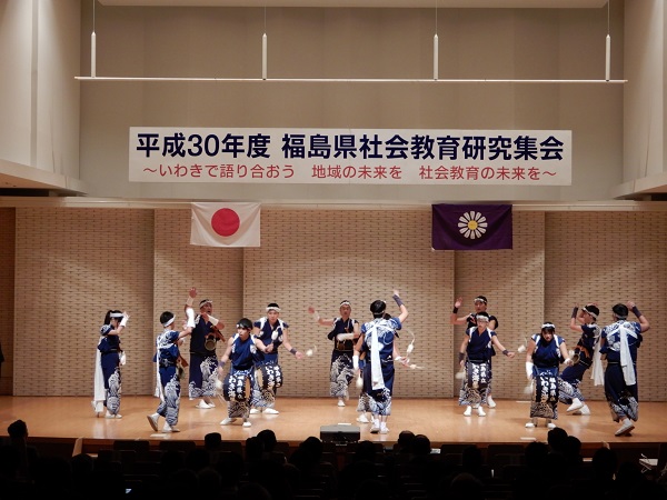 平成30年10月4日(木)、いわき市文化センターにおいて、平成30年度福島県社会教育研究集会が開催されました。私たち、チーム「じゃんがら」は、オープニングアトラクションとして、「じゃんがら念仏踊り」を披露しました。県内各地から来られた多くの皆様の前での演舞に、緊張もありましたが、気を引き締めて心を込め演舞に集中することが出来ました。