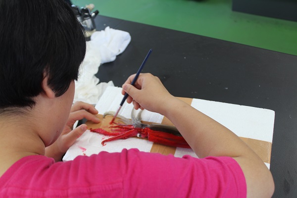 水気をふき取り、口やエラなどに詰め物をしたあと、丁寧に絵具を塗ります。