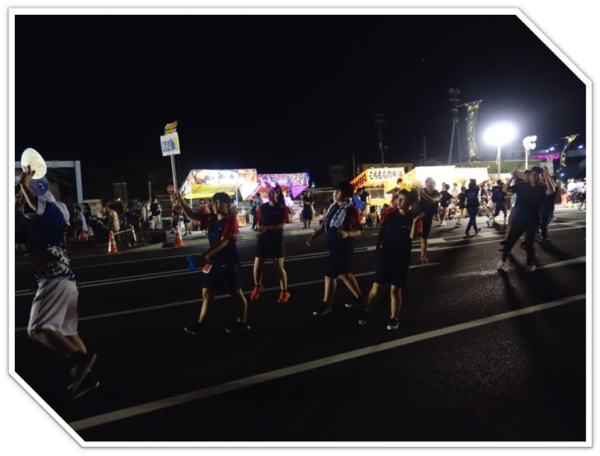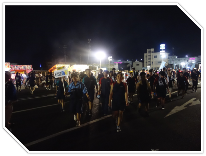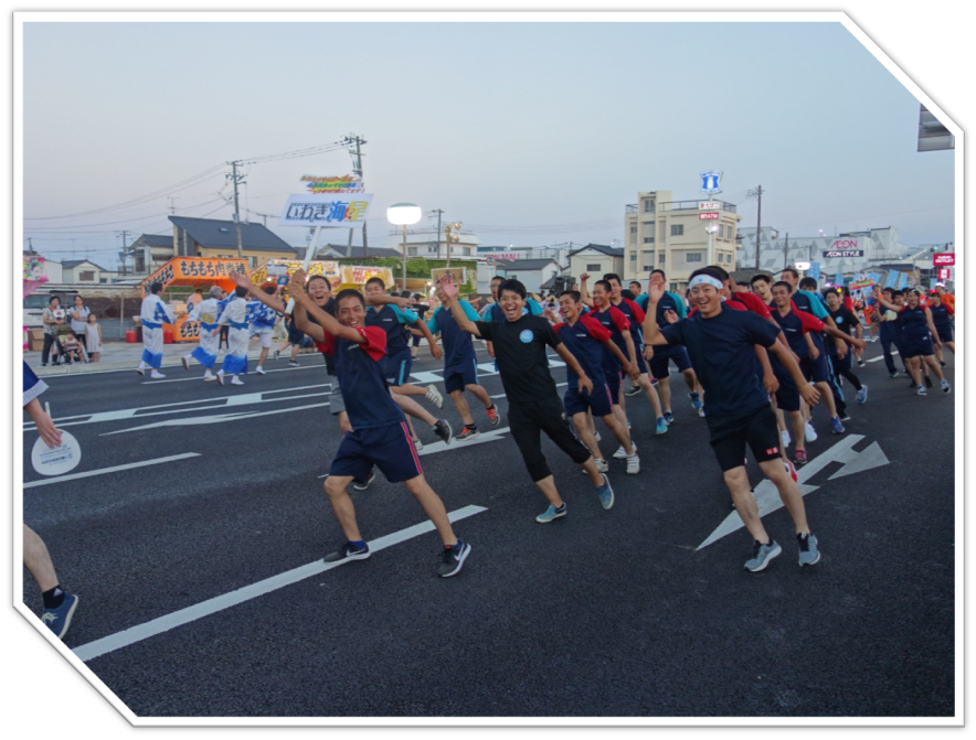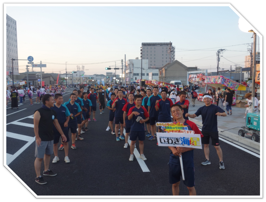 毎年恒例となっているいわきおどり小名浜大会に、今年からいわき海星高校も参加することになりました。地域貢献をしたいという想いから、32名の本科生・専攻科生が参加し、とにかく『楽しむこと』を第一とし最後まで踊り続けました。