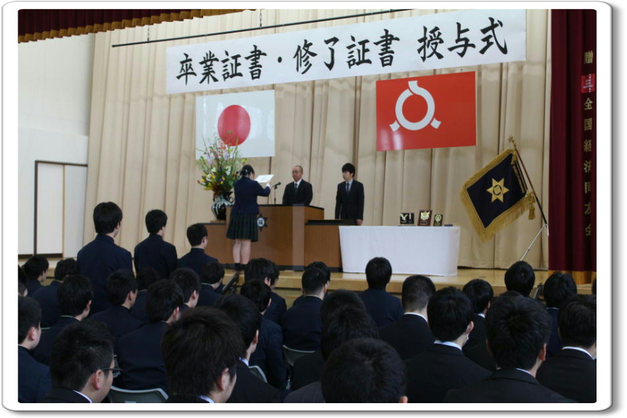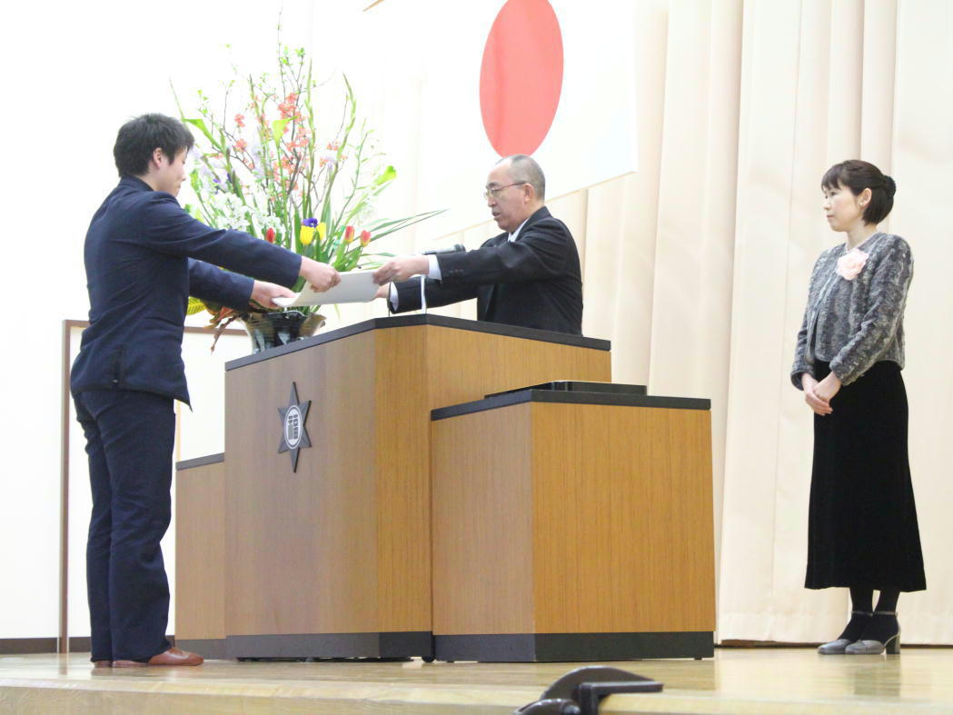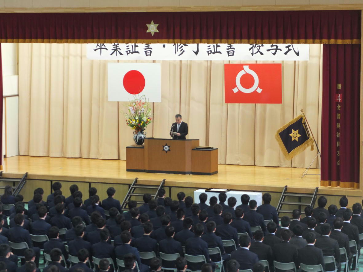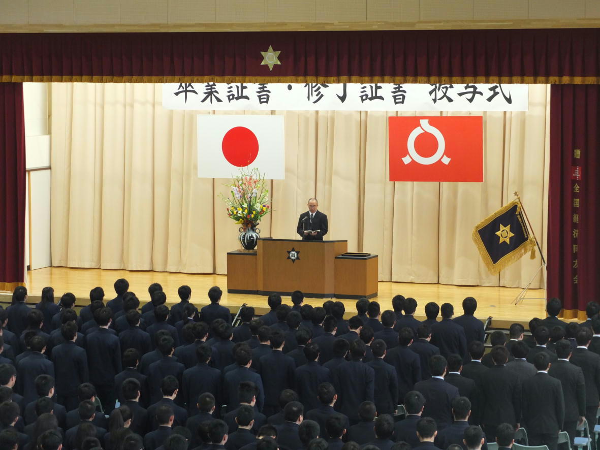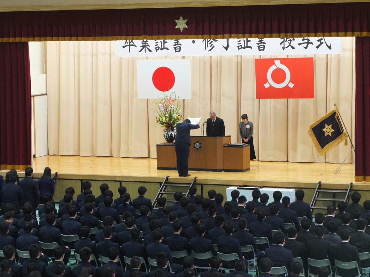 本科(海洋科、食品システム科、情報通信科、海洋工学科)129名、専攻科(海洋科、無線通信科、機関科)19名、計148名の呼名の後、各科代表に証書が授与されました。