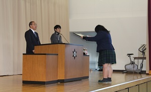 始業式に先立ち、新生徒会役員の任命式も行われました。これからの1年間、リーダーシップを発揮して頑張ってください。