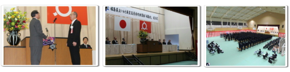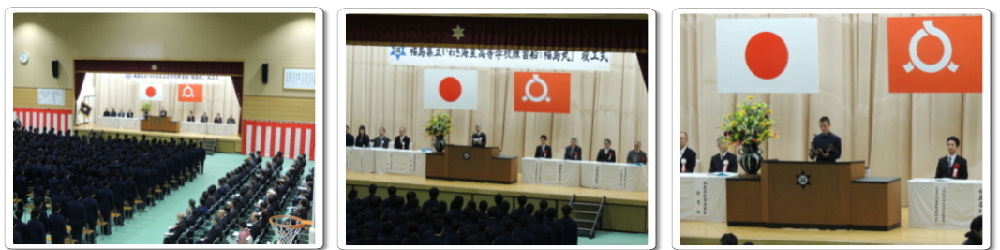 福島県教育委員会教育長式辞、福島県知事挨拶、そして、ご来賓の皆様よりご祝辞を頂戴しました。これに対して、本校校長よりの謝辞、生徒代表 草野弘雅君(海洋工学科2年)からの「喜びの言葉」、そして、本校同窓会会長より福島丸の安全航海・安全実習を祈念しての大漁旗寄贈が行われ、生徒全員で校歌を斉唱し、式を閉じました。