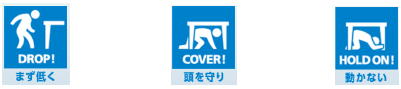 「① まず低く(DROP) ② 頭を守り(COVER) ③ 動かない(HOLD ON)」