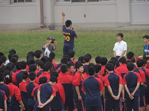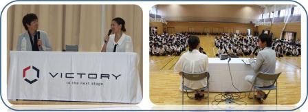 平成29年9月22日(金)、4校時目から北京オリンピックに出場され、バドミントン女子ダブルスで5位入賞をしたこともある小椋久美子さんを講師としてお招き、VICTORYスポーツ教室を開催しました。また、KFBアナウンサーである池田速人さんに司会進行役を務めていただきました。小椋さんのスポーツに対する思いや体験談等、約1時間にわたり講演していただきました。