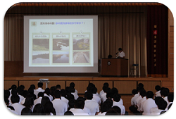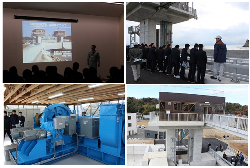本校に隣接する神白川水門が完成しました。お披露目を兼ねた見学会が本校の視聴覚室にて開催され、工事担当者からの概要説明並びに現場見学を行いました。見学会には本校の生徒のみならず、多くの近隣住民の方のご参加をいただきました。