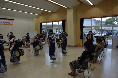 今回は、震災学習ならびに本校との授業交流を行いました。また、伝統芸能であるじゃんがら念仏踊りを披露し、