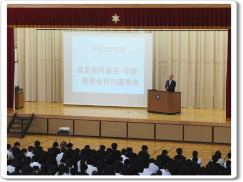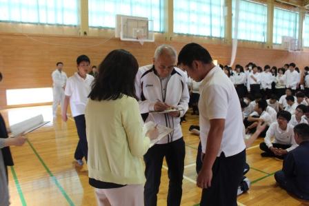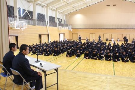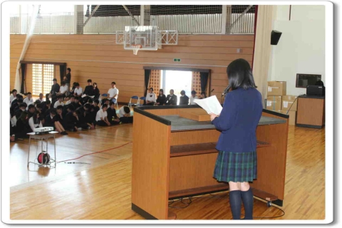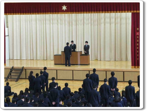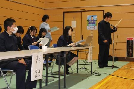 議長進行役として、議長は四家里季也くん、副議長は戸田寛人くん、書記は吉田連くんが務めました。生徒総会では、生徒会から昨年度の決算報告や今年度の行事計画案の報告がありました。また、生徒から学校に対する要望や提案などを話し合う場も設けられ、活発な意見が交わさせました。