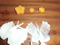 大根でイチョウの葉などの切り方を練習しました。とても難しかったのですが、個性的な形ができあがりました。