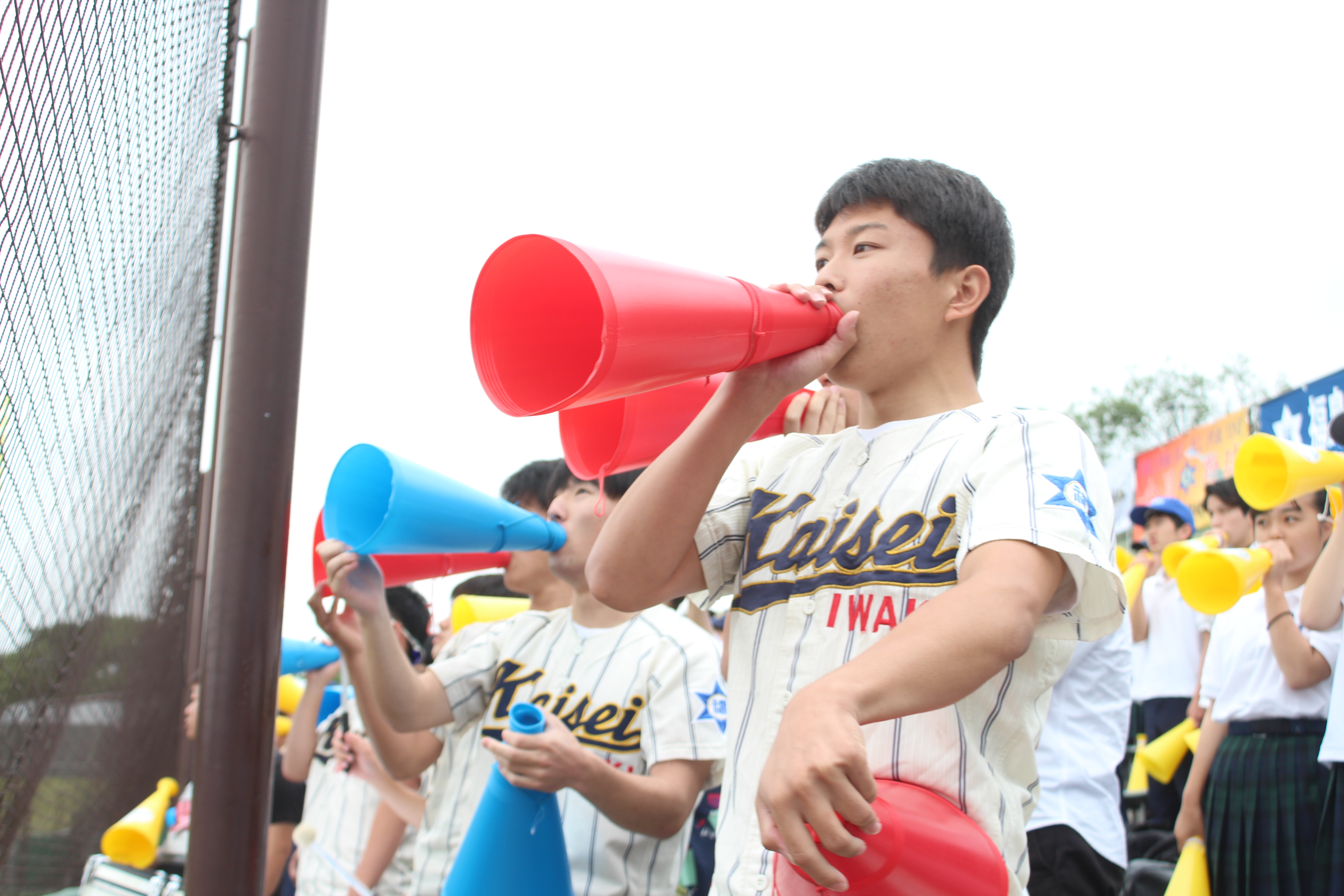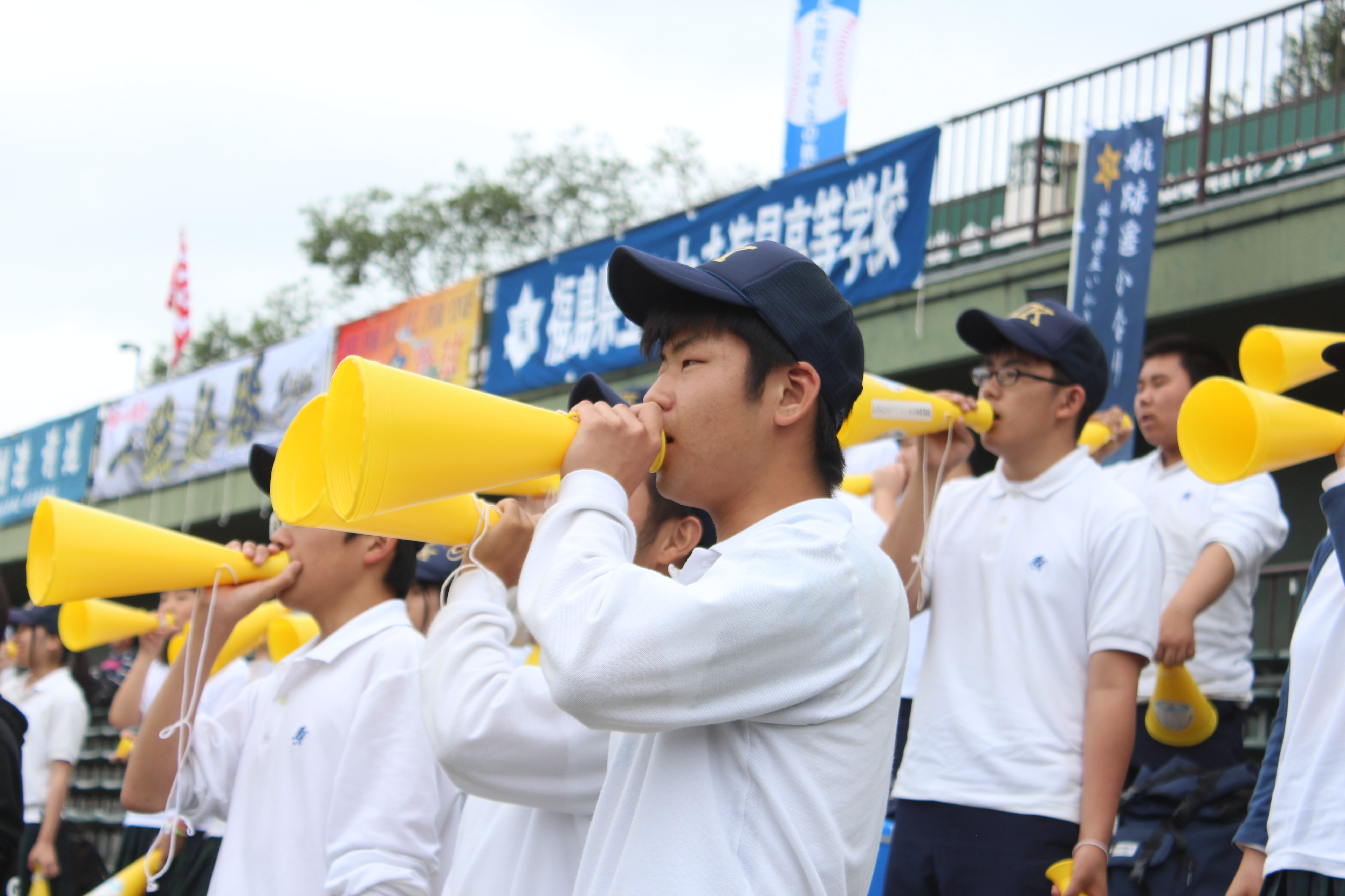 今年も野球部に力を与えるべく、生徒会役員、応援委員、有志の生徒たちが1か月前から応援練習を始め、この日のために準備してきました。当日はそれらに加えて、保護者や卒業生、その他関係する方々からも声援を送っていただきました。