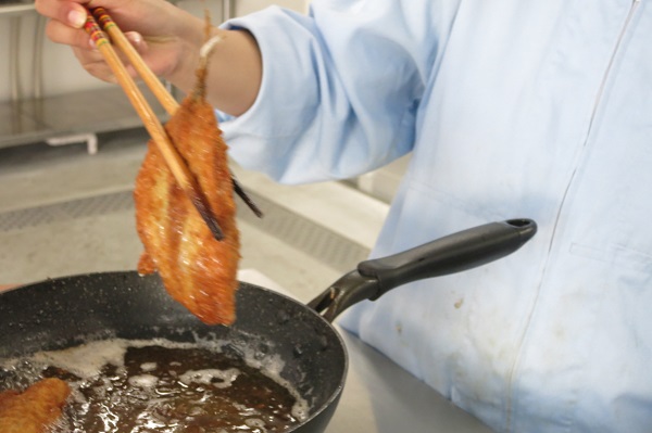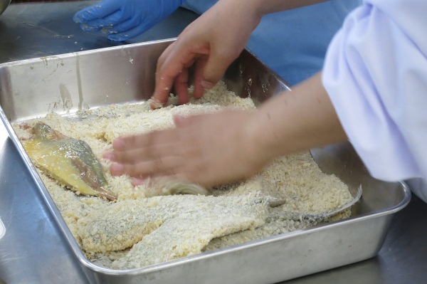 2品目は「食品技能コンテスト」の課題となっている「3枚おろし」の練習もかねてアジフライを作りました。