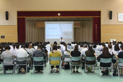 全体会では、校長あいさつ、本校の4学科の特色や学習内容の紹介をしました。