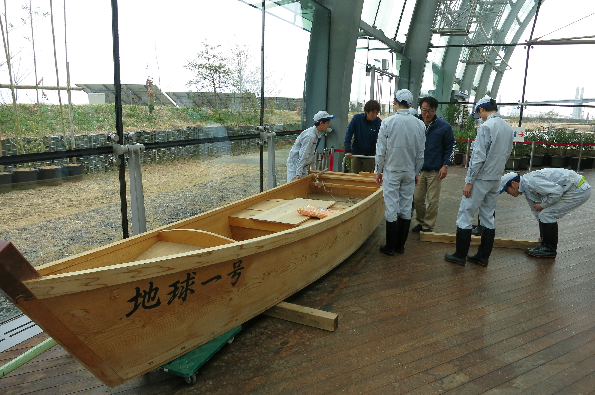 伝馬船「地球一号」は、館内入口付近で展示されていましたが、今回はそれを外へ運び出すお手伝いさせていただきました。500キロ以上ある伝馬船を台車に乗せ、落とさないようにみんなで協力して運びました。