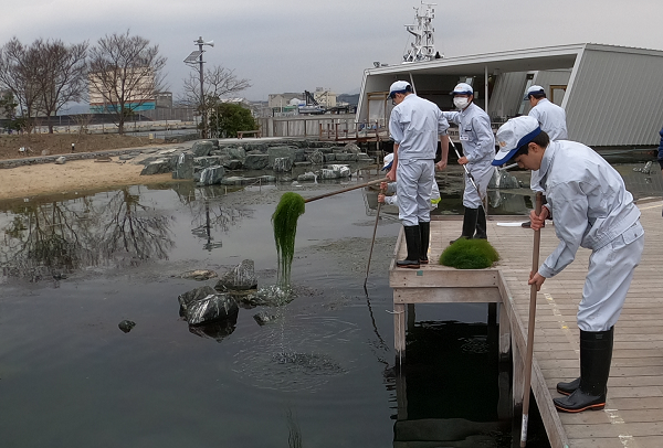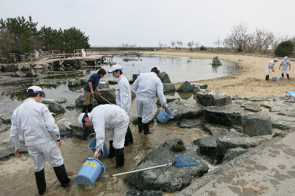 本日は、14回目のアクアマリンふくしまの体験実習を実施しました。今回の実習は、伝馬船の運び出しと蛇の目ビーチへの砂入れ、ルビ取りでした。