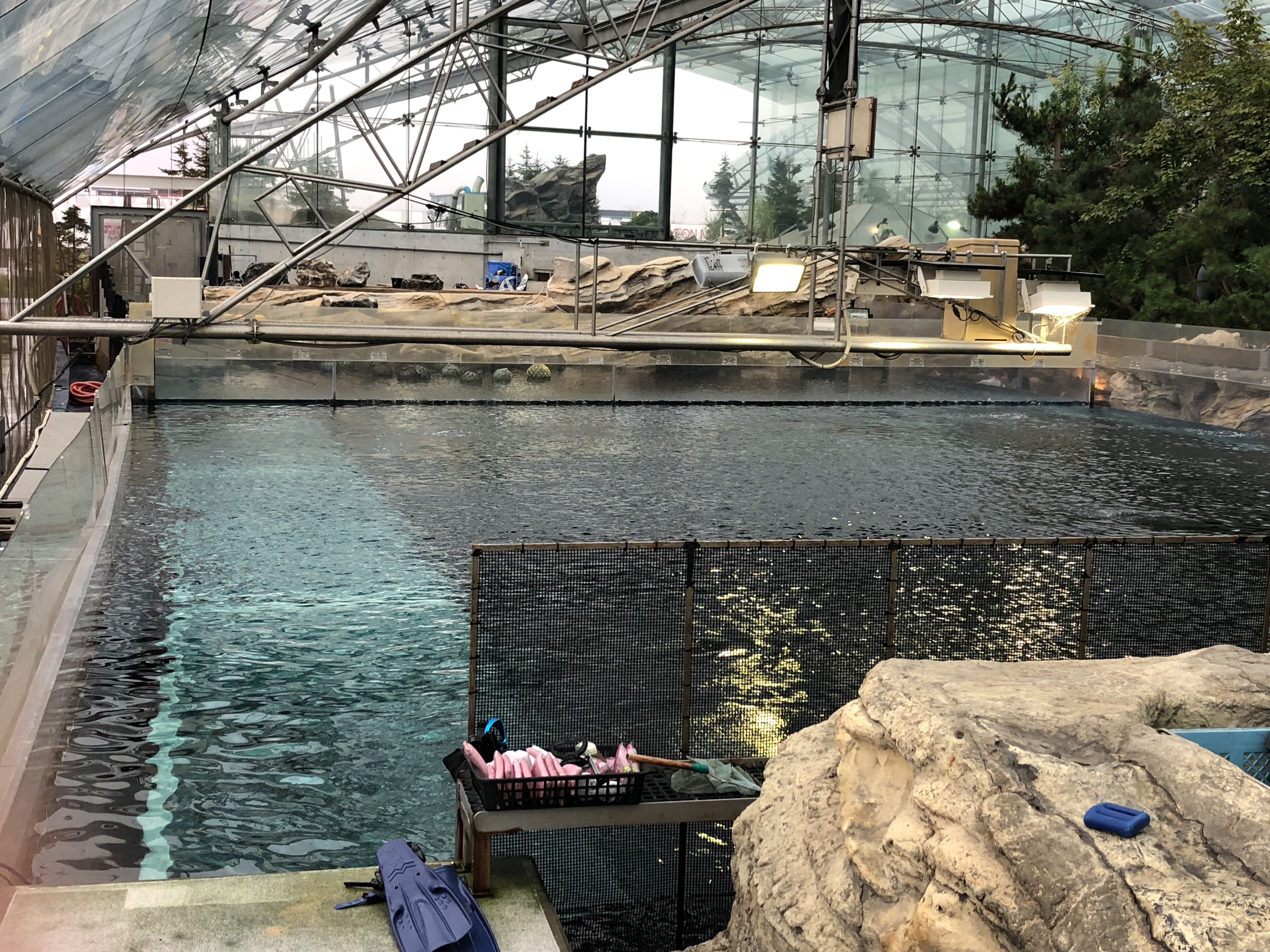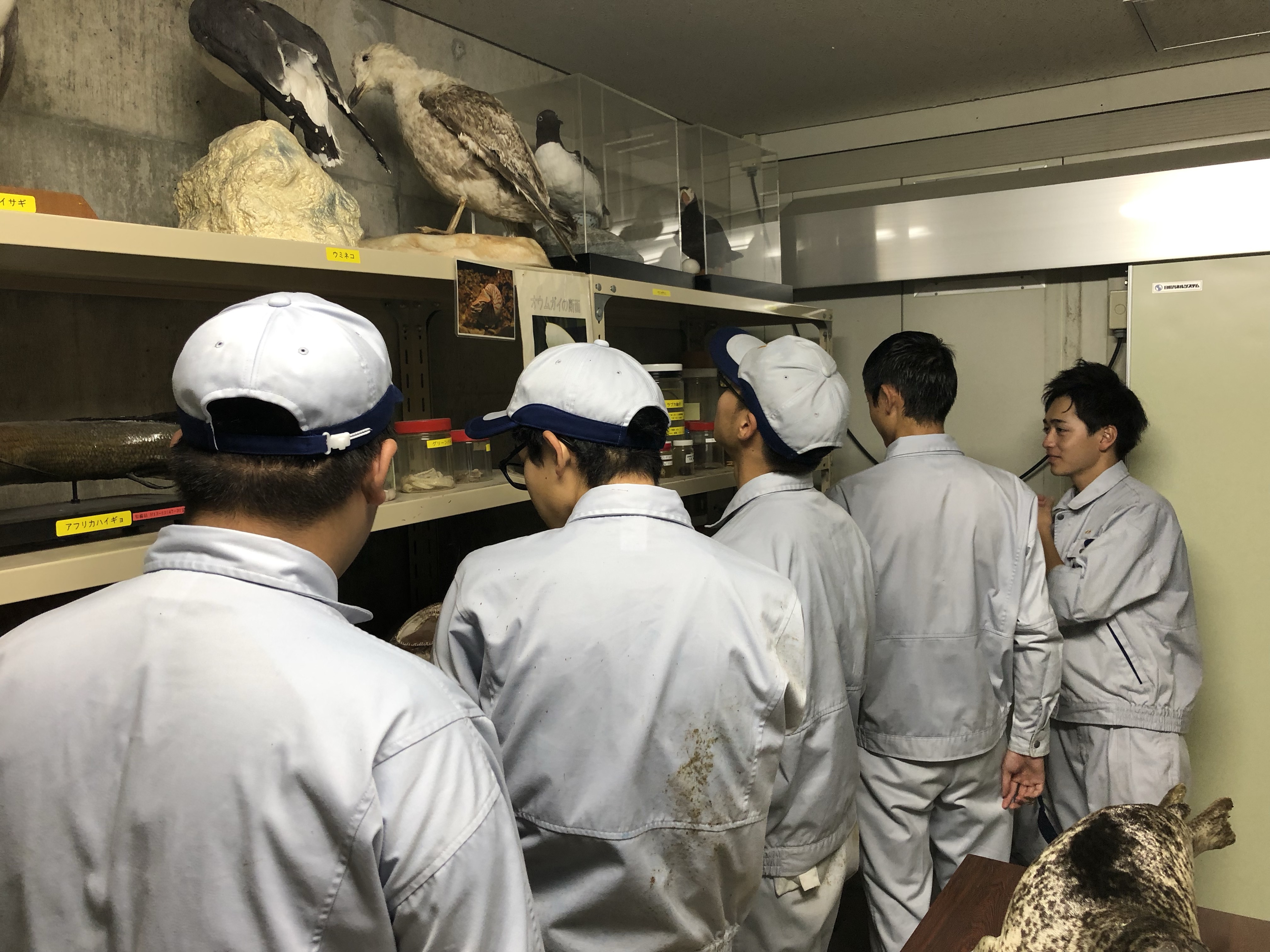 実習の後半は、まだ行ったことがなかったバックヤードや大水槽の裏側を見学しました。サメのあごやゴマアザラシの剥製を見ているときの生徒たちは心を躍らせていました。