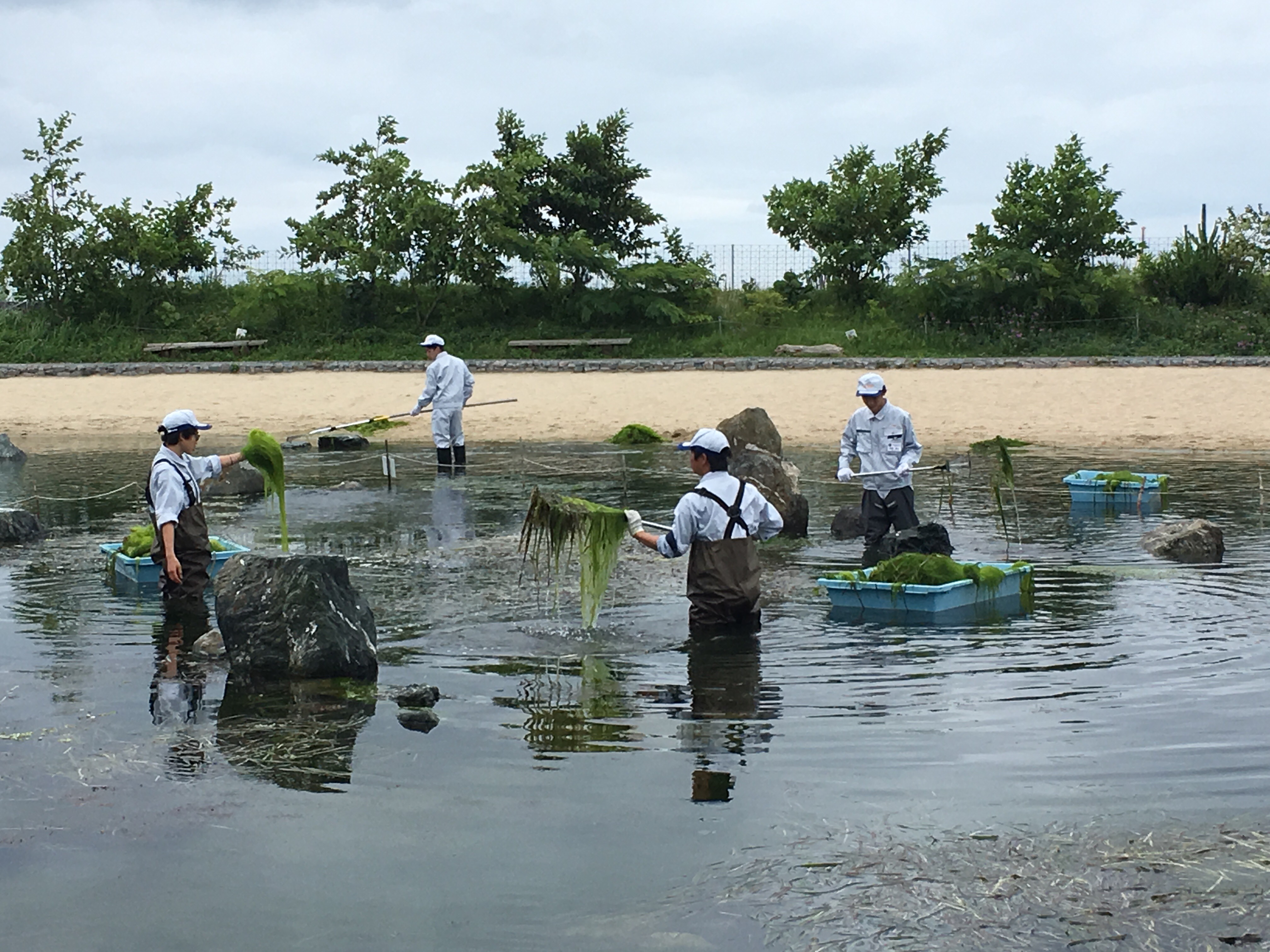本日は、5回目のアクアマリンふくしまの体験実習を実施しました。今回の実習は、ルビ取りとアジ釣りでした。数珠藻は、この時期になると大量発生し、ボランティアの方でも処理をするのが大変とのことです。また、アジ釣りはフィーディングタイムに使う餌で、本来ならばボランティアの方々が行う作業ですが、担当者のご厚意で生徒たちに体験させてくれました。