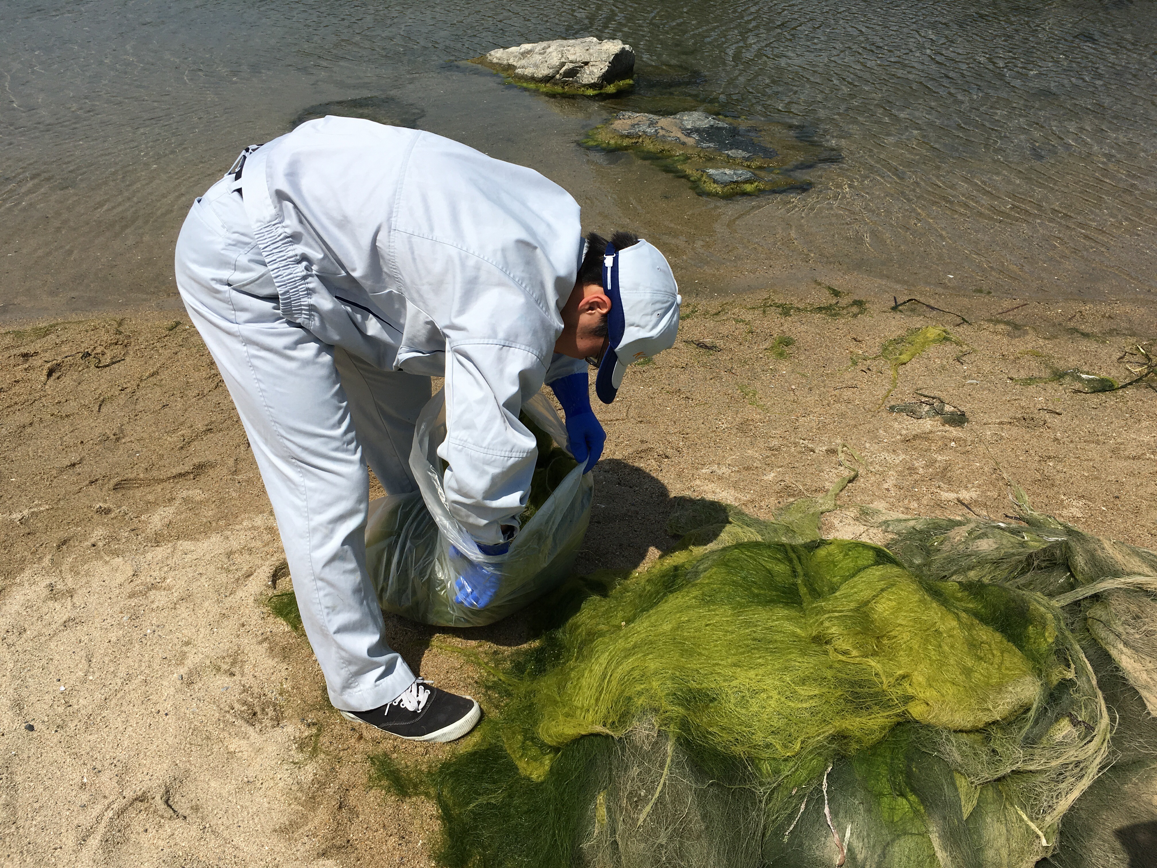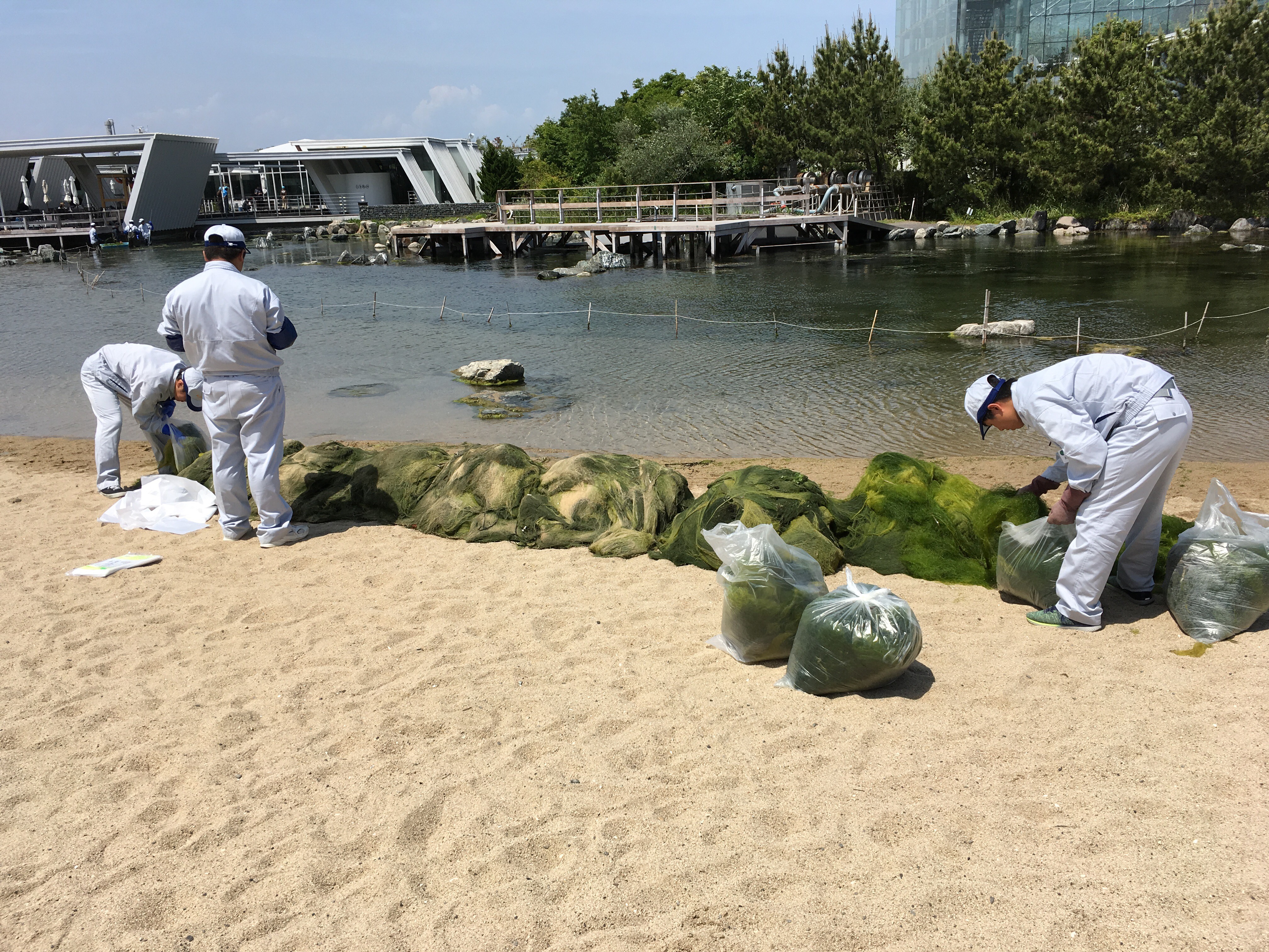 蛇の目ビーチに大量発生した藻を熊手でかき集めている様子