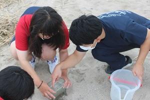 砂の中にマイクロプラスチックがあるか調査をしている様子