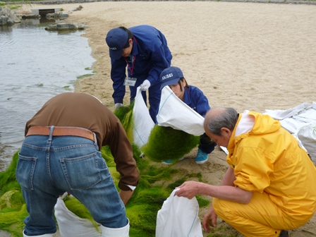 本日は、蛇の目ビーチで増えすぎた海藻(ジュズモ)の除去作業で袋詰めのお手伝いをしました。