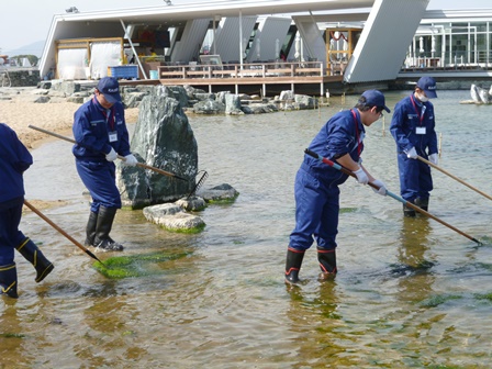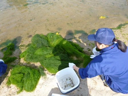 蛇の目ビーチで海藻(ジュズモ)掃除