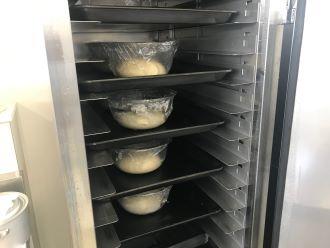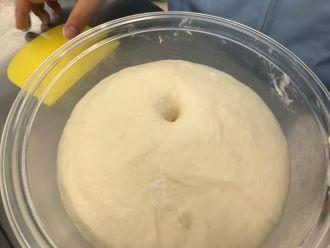 一次発酵がきちんとできたかフィンガーテスト(左)で確認し、ガス抜き(右)を行う
