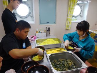食事当番やブリッジでの当直の実習を通し、船での仕事について学びました。