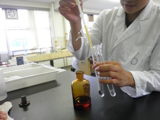 温めた試験管中の溶液に、ヨウ素溶液を加えます。