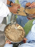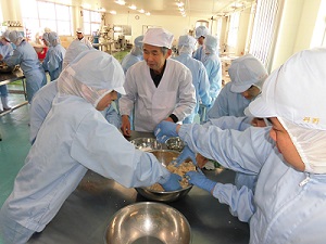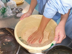 灰汁を取りながら3時間ほどかけて煮た大豆をミンチ状にします。そこに麹と塩と水を加え、しっかりと混ぜ合わせ