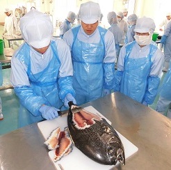 ★「エチオピア(シマガツオ)」の調理法と下処理について学びました。鱗を切り取り、頭を落として