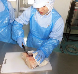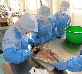 内臓を取り出し切り身にします。骨が硬く切りにくいところもありましたが、力を込めて取り組みました。