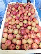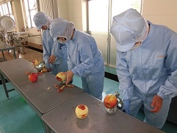 たくさんのリンゴ。 一個ずつ丁寧に皮をむき、カットします。