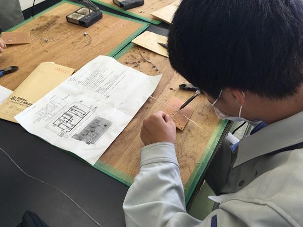 FMワイヤレスラジオの製作 回路図を見ながら部品をはんだ付けしています。